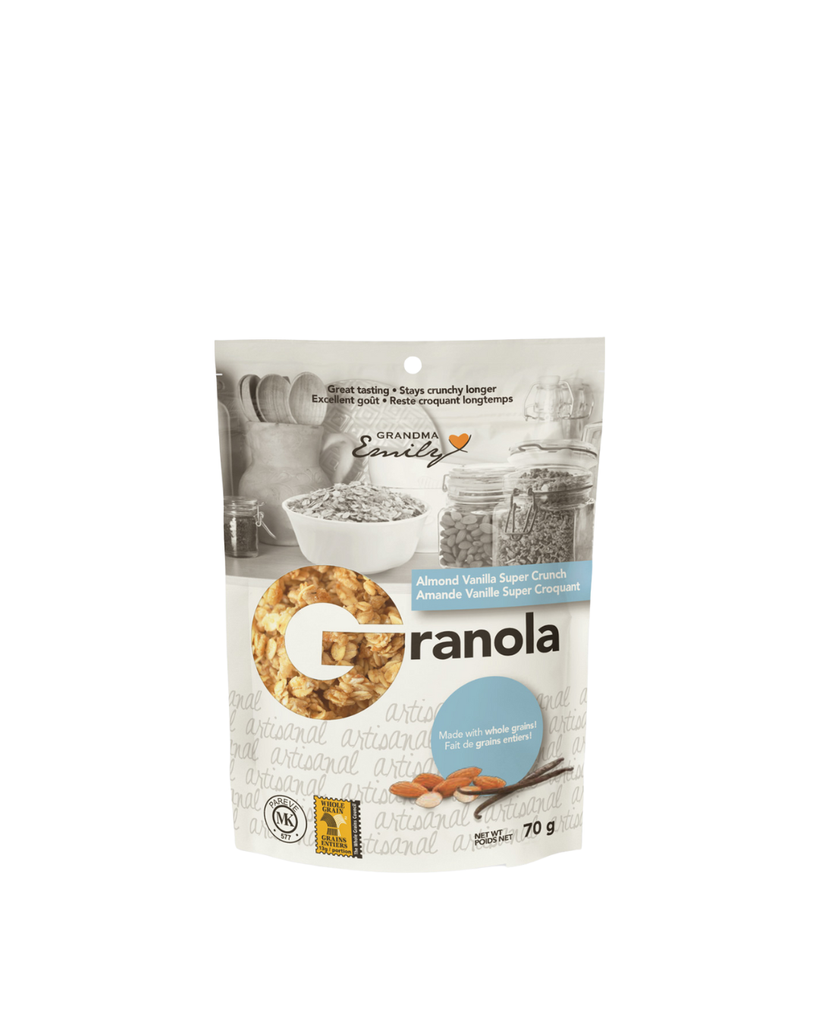 Notre granola Super Crunch aux amandes et à la vanille est le choix idéal pour le petit-déjeuner ou une collation rapide. Maintenant disponible en format à emporter. Notre granola croquant fait à la main reste croquant plus longtemps et vous offre une texture et une expérience gustative incroyables. Il ne contient pas de gras trans ni de cholestérol, et constitue également une source naturelle de fer. Kasher et végétalien.