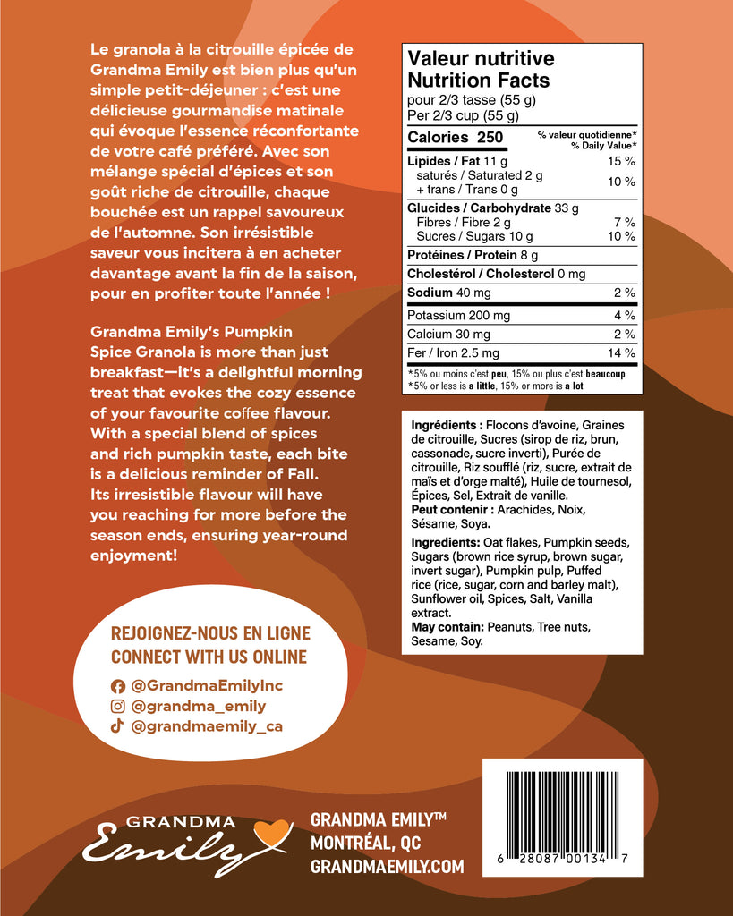 Le granola à la citrouille et aux épices de Grandma Emily est bien plus qu'un simple petit-déjeuner : c'est une délicieuse gourmandise matinale qui évoque la saveur réconfortante de votre café préféré. Grâce à son mélange unique d'épices et à son riche goût de citrouille, chaque bouchée est un délicieux rappel de l'automne. Son goût exquis vous donnera envie d'en reprendre avant la fin de la saison, pour un plaisir tout au long de l'année.